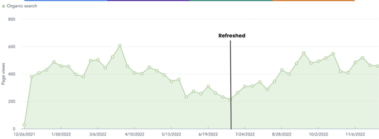 Here’s an example of a blog post that we recently refreshed. It had been losing traffic week-over-week for a couple months. We went through and updated the copy, added new examples and images, and replaced old links. The post immediately started performing better and in about a month had returned to previous highs.